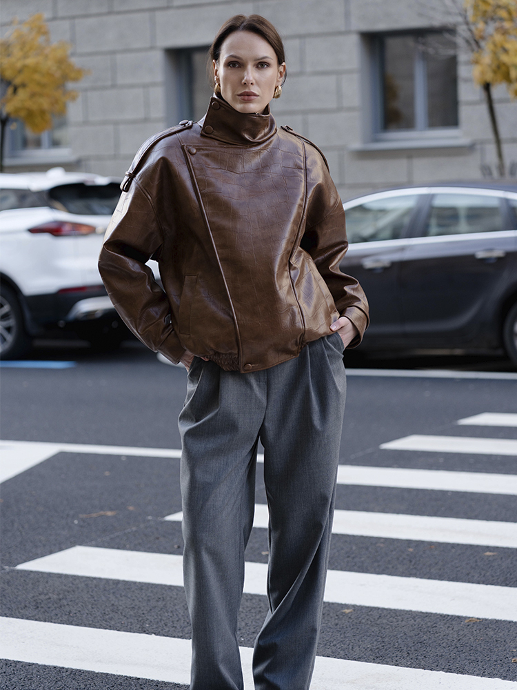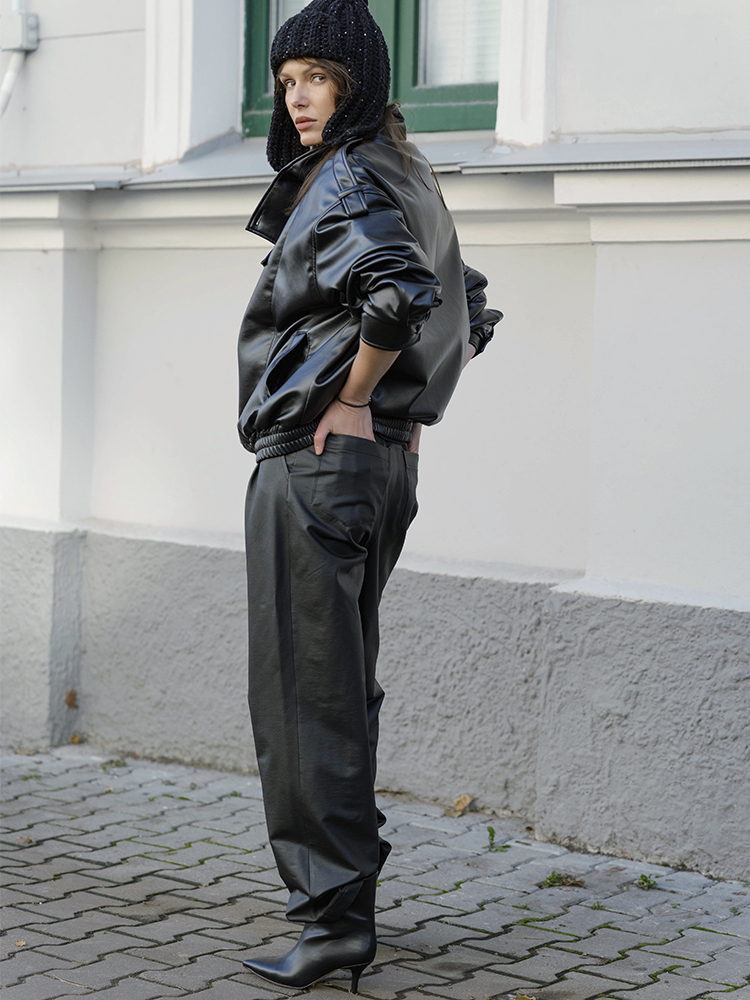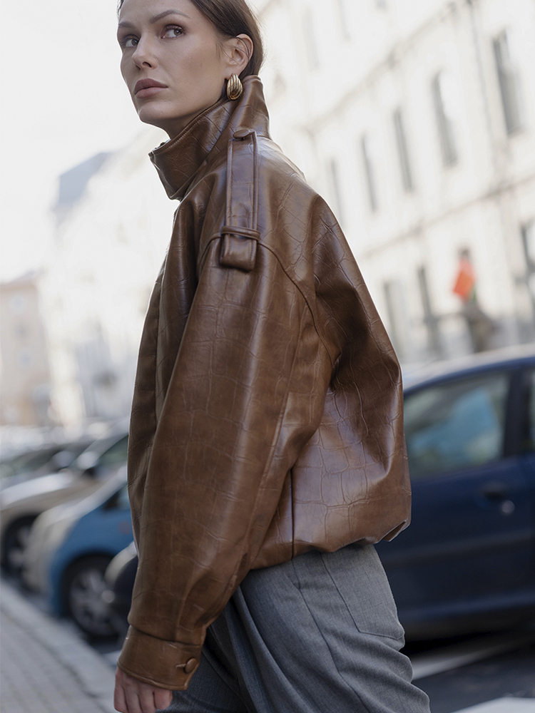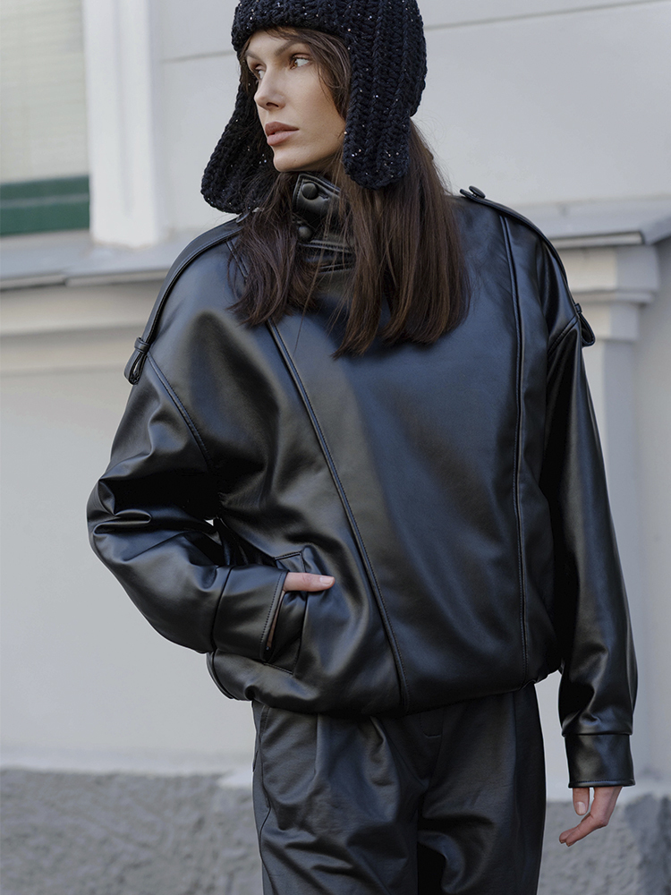 Свободный силуэт и продуманные детали, такие как высокий воротник, застёжки, манжеты и эластичная сборка по низу, делают бомбер универсальным для повседневных и городских образов.